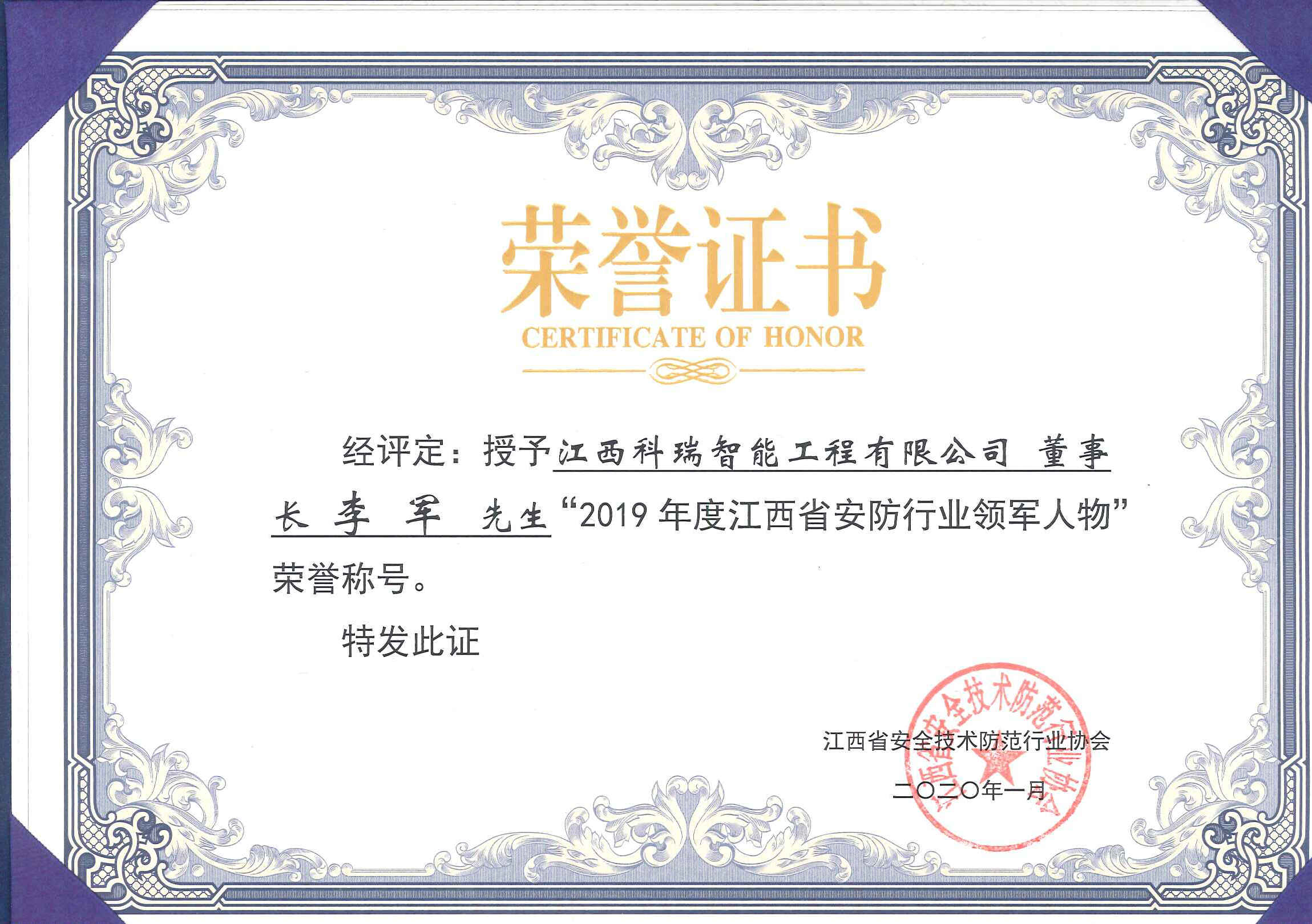 1月9日,在江西安防協(xié)會(huì)第五屆第三次會(huì)員代表大會(huì)暨2020科瑞之夜新春年會(huì)上進(jìn)行了2019年優(yōu)秀企業(yè)及領(lǐng)軍人物頒獎(jiǎng)、慈善募捐等活動(dòng),科瑞智能喜獲“2019年江西省優(yōu)秀安防工程企業(yè)”、公司董事長(zhǎng)李軍先生被授于“2019年度江西省安防行業(yè)領(lǐng)軍人物”榮譽(yù)稱號(hào)。